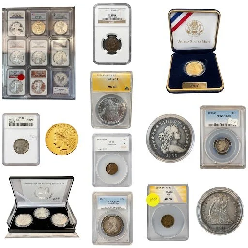 Quinn’s Auction Galleries presents a large collection of U.S. coins, including 1909-S VDB Lincoln Penny VF-20, 1910 10 Dollar Gold Indian Head, 1799 Draped Bust Dollar, and 1793 Flowing Hair Wreath Cent.